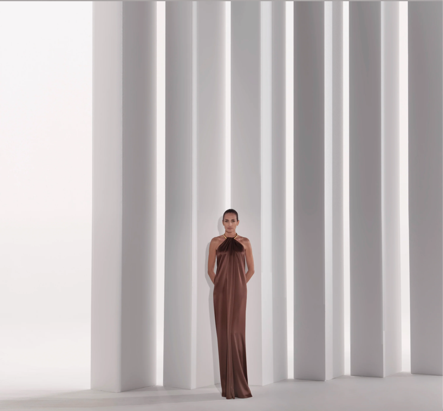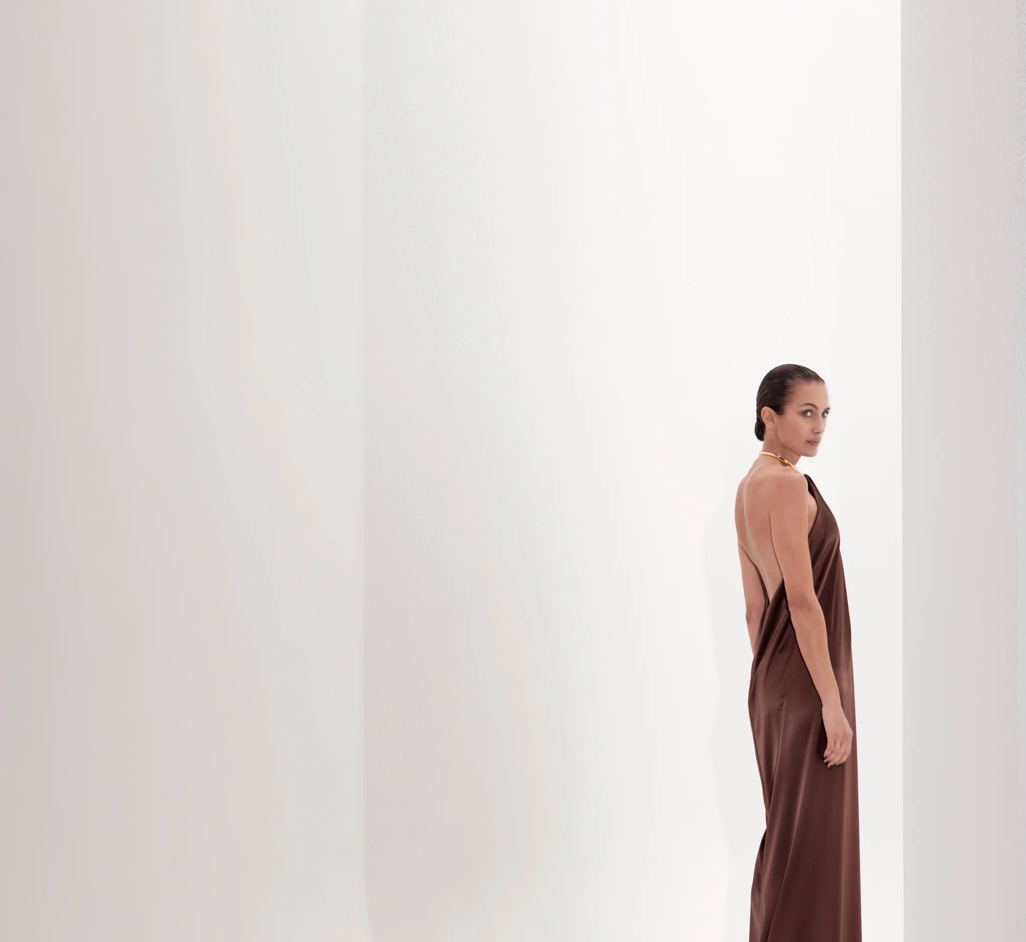 SUNDRESS IN SATIN CRÊPE HELD AT THE NECK BY A BANGLE NECKLACE IN GOLDEN METAL.