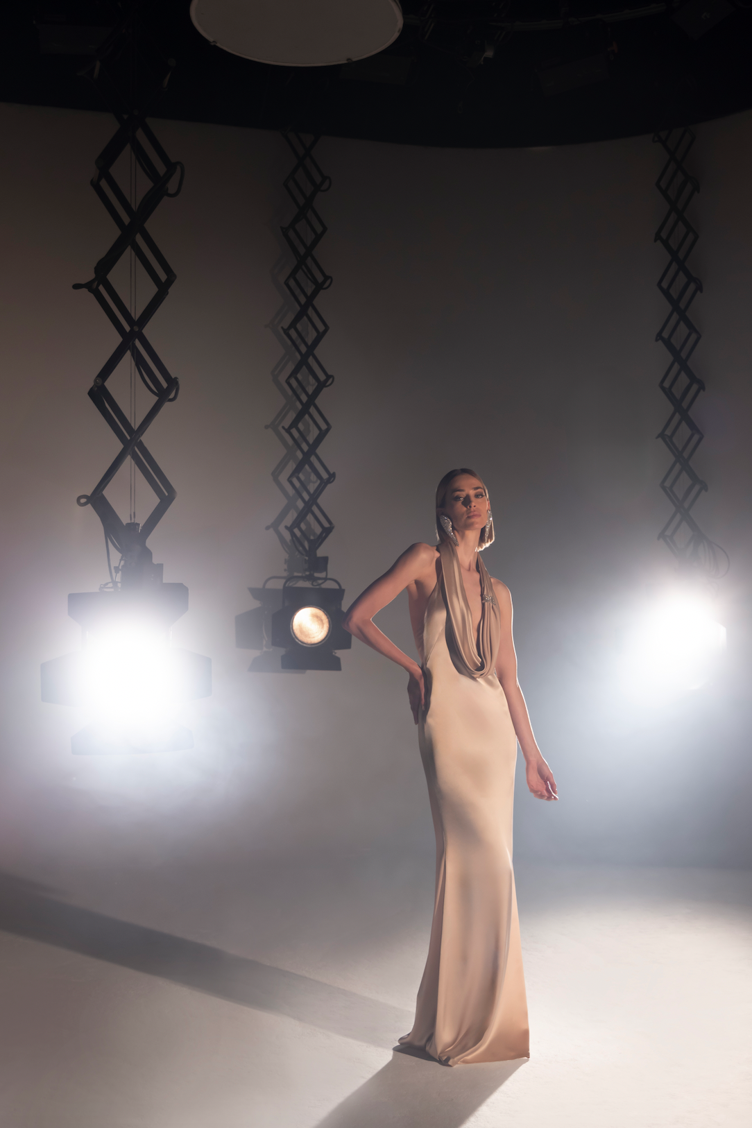DRAPED SATIN CREPE SHEATH DRESS WITH A CRYSTAL-EMBROIDERED COWL NECKLINE.