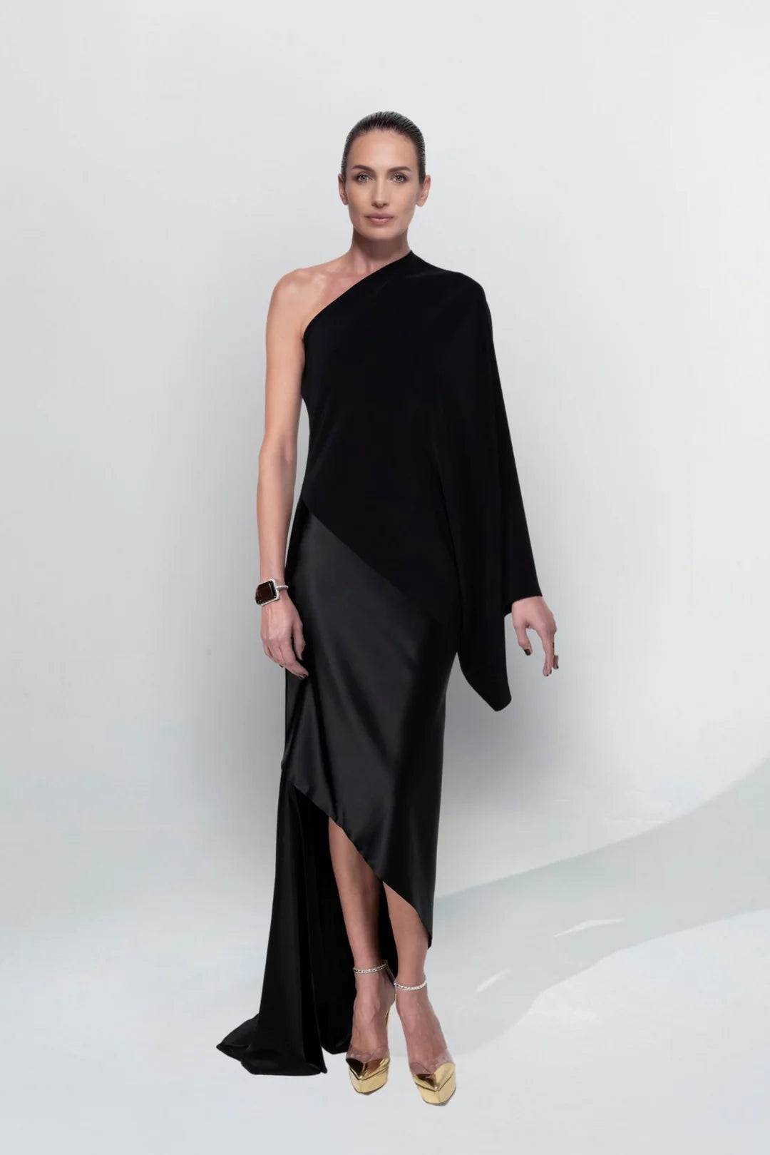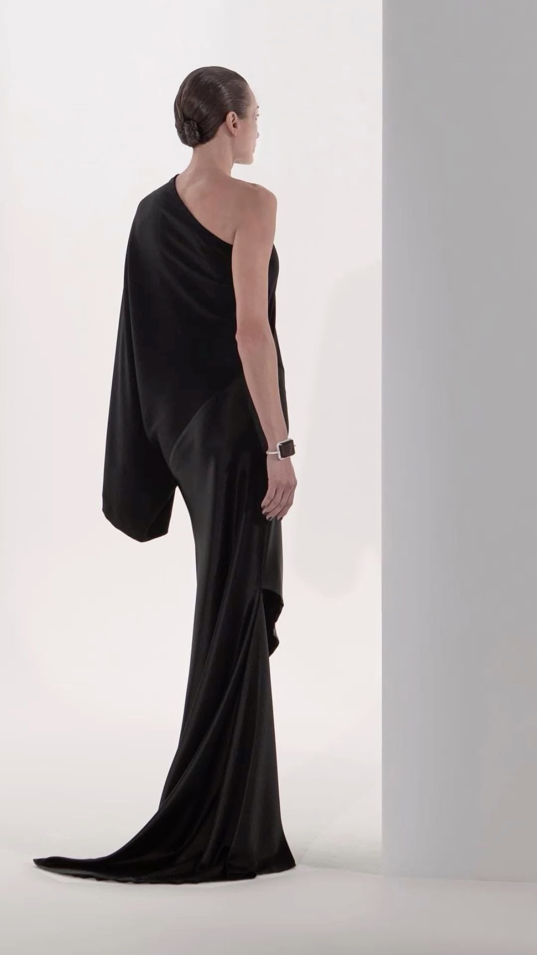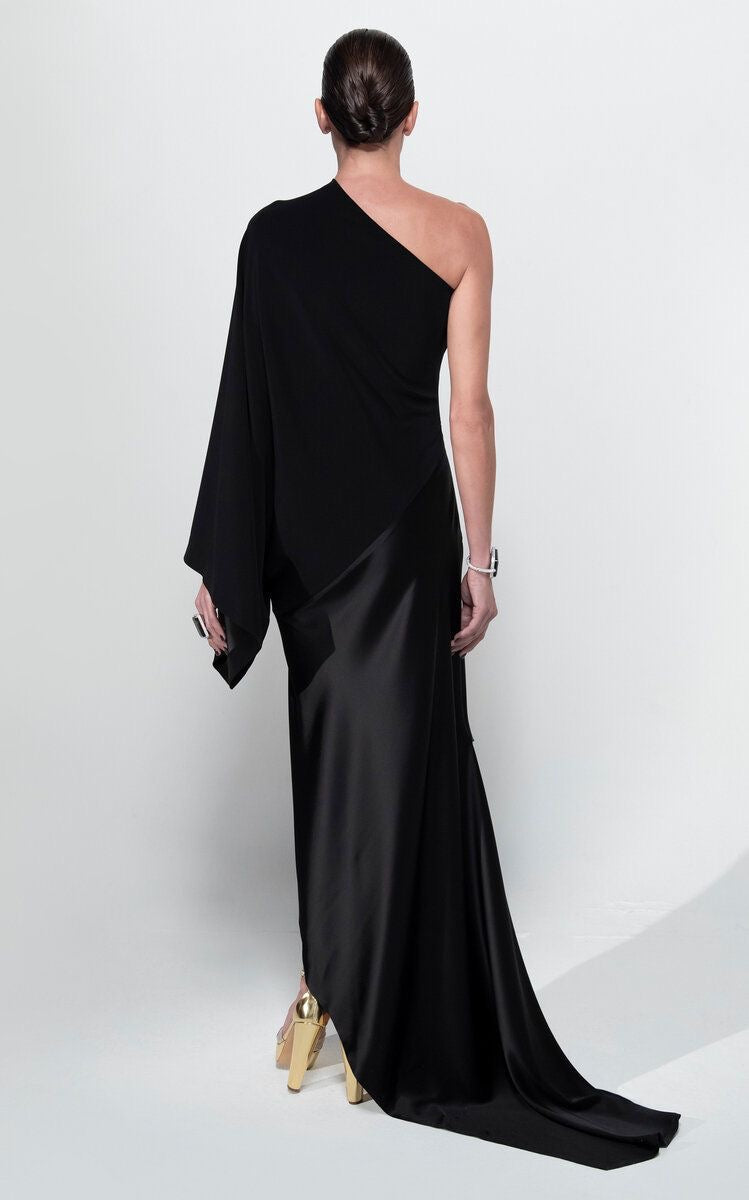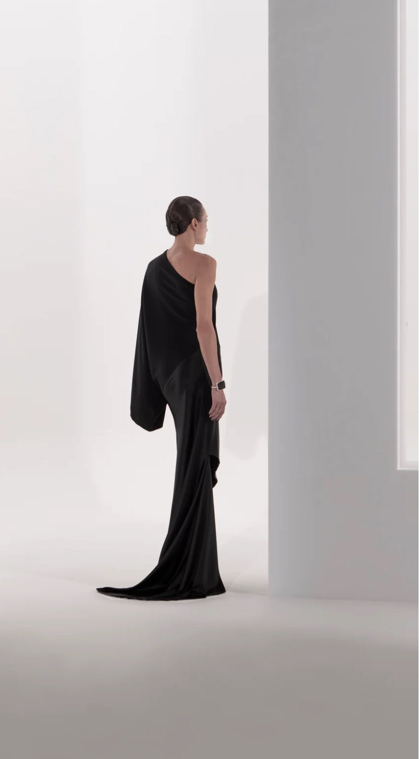 VESTAL DRESS WITH PANNELS, DEEP V NECK AND OPEN BACK, IN CRÊPE, WITH A BELT AT THE WAIST