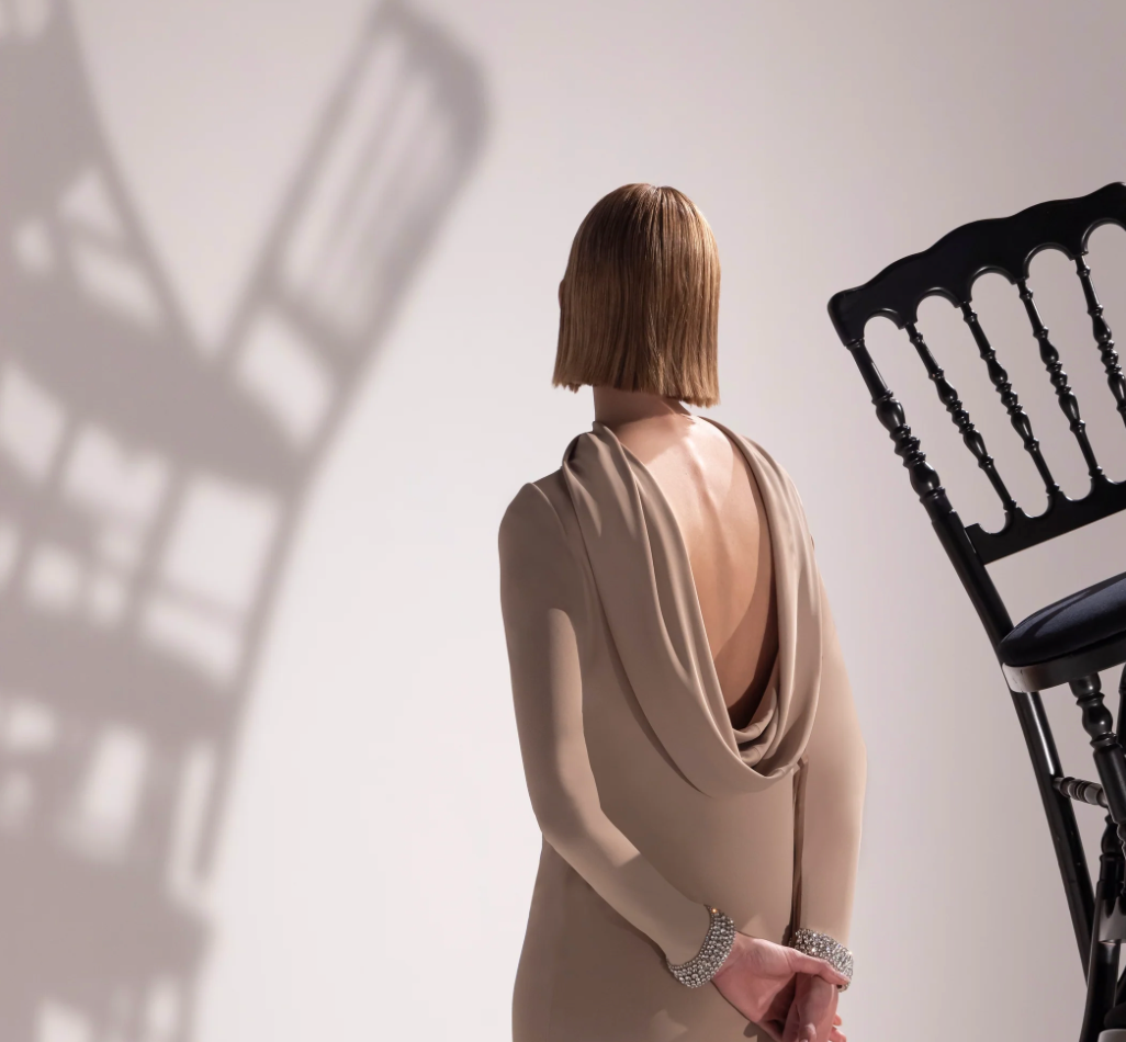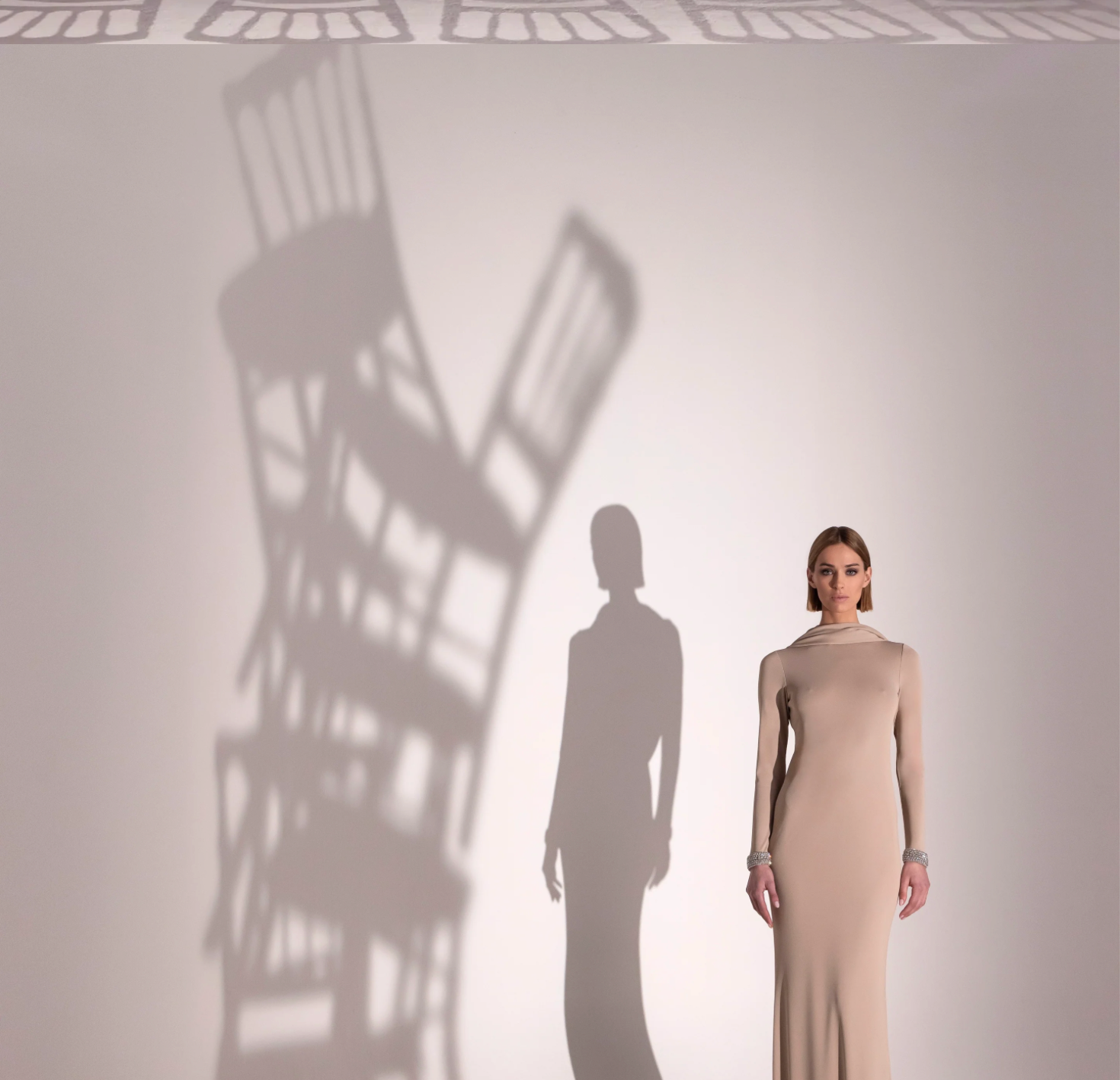 LONG KNITTED JERSEY DRESS WITH AN OPEN BACK, FEATURING A DRAPED COWL NECKLINE AND CRYSTAL EMBROIDERY AT THE CUFFS.